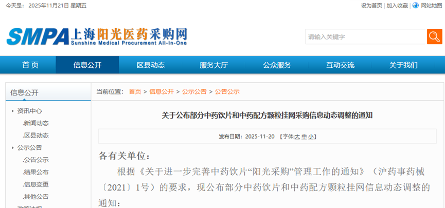 此次部分中药饮片和中药配方颗粒的挂网采购信息动态调整将通过门户网站(www.smpaa.cn中药饮片信息申报-业务经办-中药饮片-中药饮片信息管理-中药饮片增量文件下载模块推送,并于20251126日生效执行。请各医保定点医疗机构(以下简称医疗机构及时下载,做好信息维护工作。