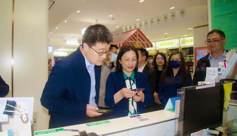 曹俊山等一行现场详细了解了第一医药商店医保药品品种销售情况,查看了店内医保信息系统的运行及大数据智能监管情况,亲切向购药的参保人员询问了电子医保卡的使用体验。
