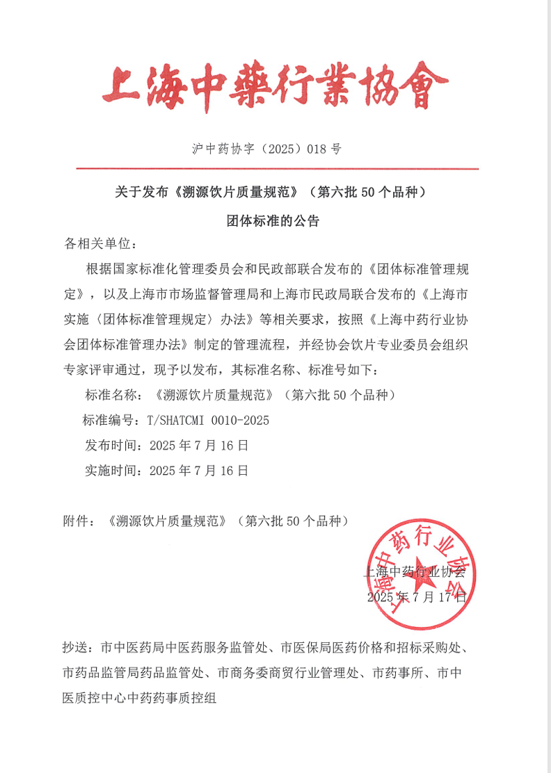 关于发布《溯源饮片质量规范》(第六批50个品种)团标公告(带附件)