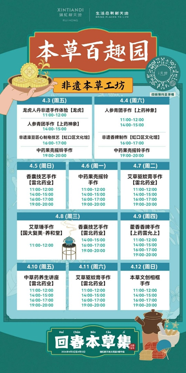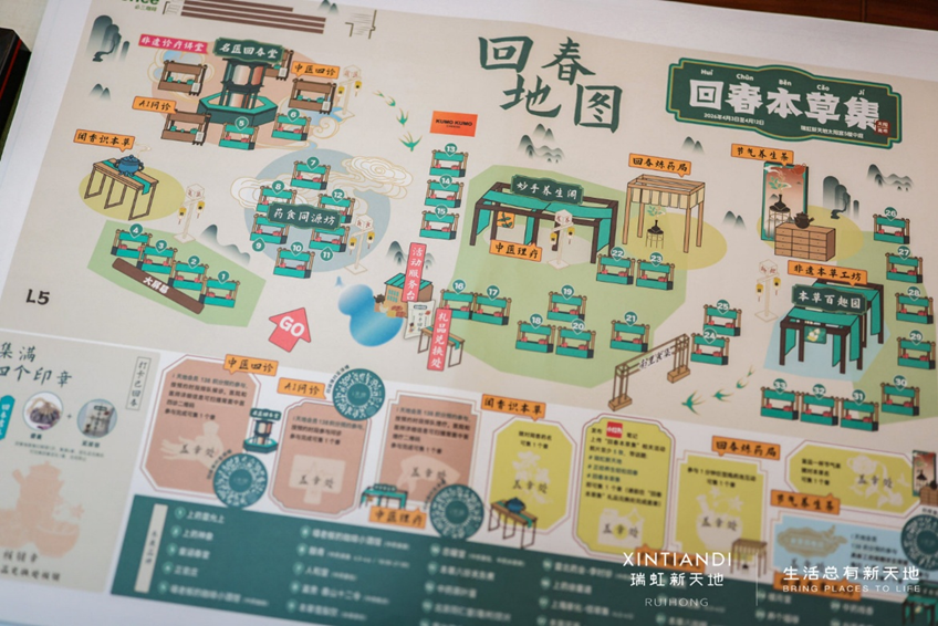 启动仪式后,瑞虹新天地回春本草集正式开市,名医问诊、理疗快充、本草美食、文创好物、手作体验等于一体的中医药文化市集轮番登场。活动不仅好玩,更好买。瑞虹新天地联动场内苍山、虹潮荟、紫玥轩等多家餐饮商户推出 “寻味本草”特色菜品,零售及康养服务品牌也推出“回春指南”体验套餐,将文化热度直接转化为消费动力,让中华优秀传统文化的传承有创新表达。活动 4 月 3 日至 4 月 12 日为期10天,瑞虹新天地 “回春本草集” 将载誉升级、重磅回归,以更专业、更沉浸、更有趣的方式,让千年中医药文化走进都市年轻人的生活场景,为消费者带来一场可感、可触、可体验的中式养生体验。